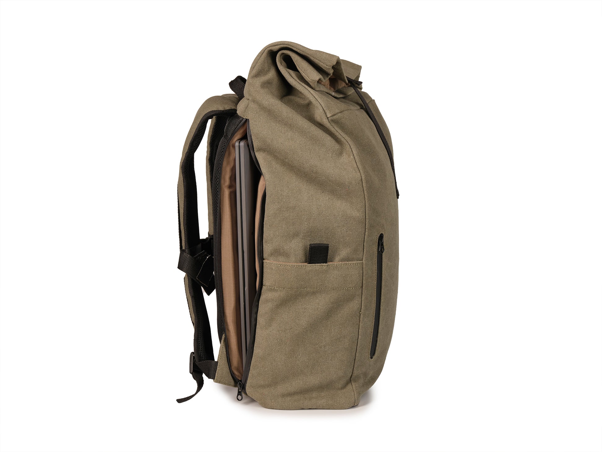 Made with locally sourced 100% cotton canvas, this rolltop backpack is for modern, mobile living.